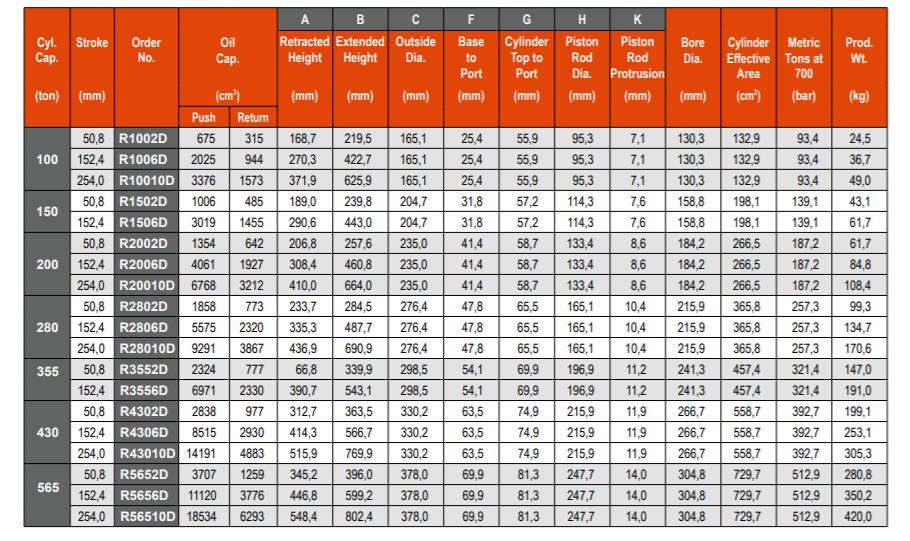 DOUBLE-ACTING, HYDRAULIC RETURN CYLINDERS TONNAGE RANGE: 100 - 565